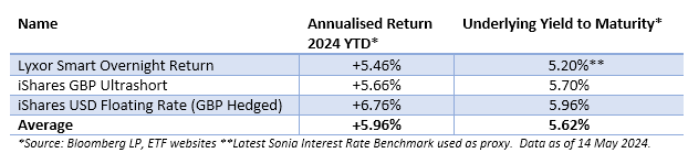 This table shows the three ETFs returns YTD (annualised) – each has produced an annualised net return ahead of the current 5.25% base rate – please note these are the actual ETF returns before the SCM and Hubwise fees and charges.